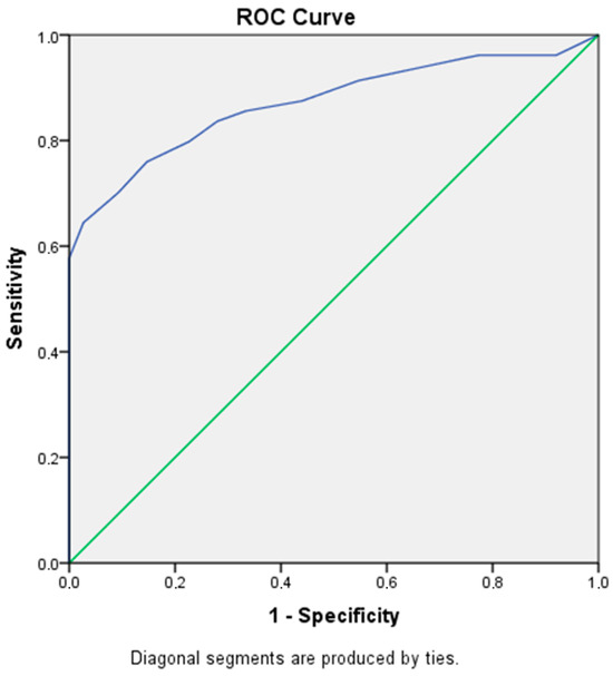 Figure 1 represents the ROC curve illustrating the discriminating performance of the MBI-C by plotting sensitivity (true positive rate) against 1–specificity (false positive rate) across all possible cutoff points. The AUC reflects excellent overall accuracy.