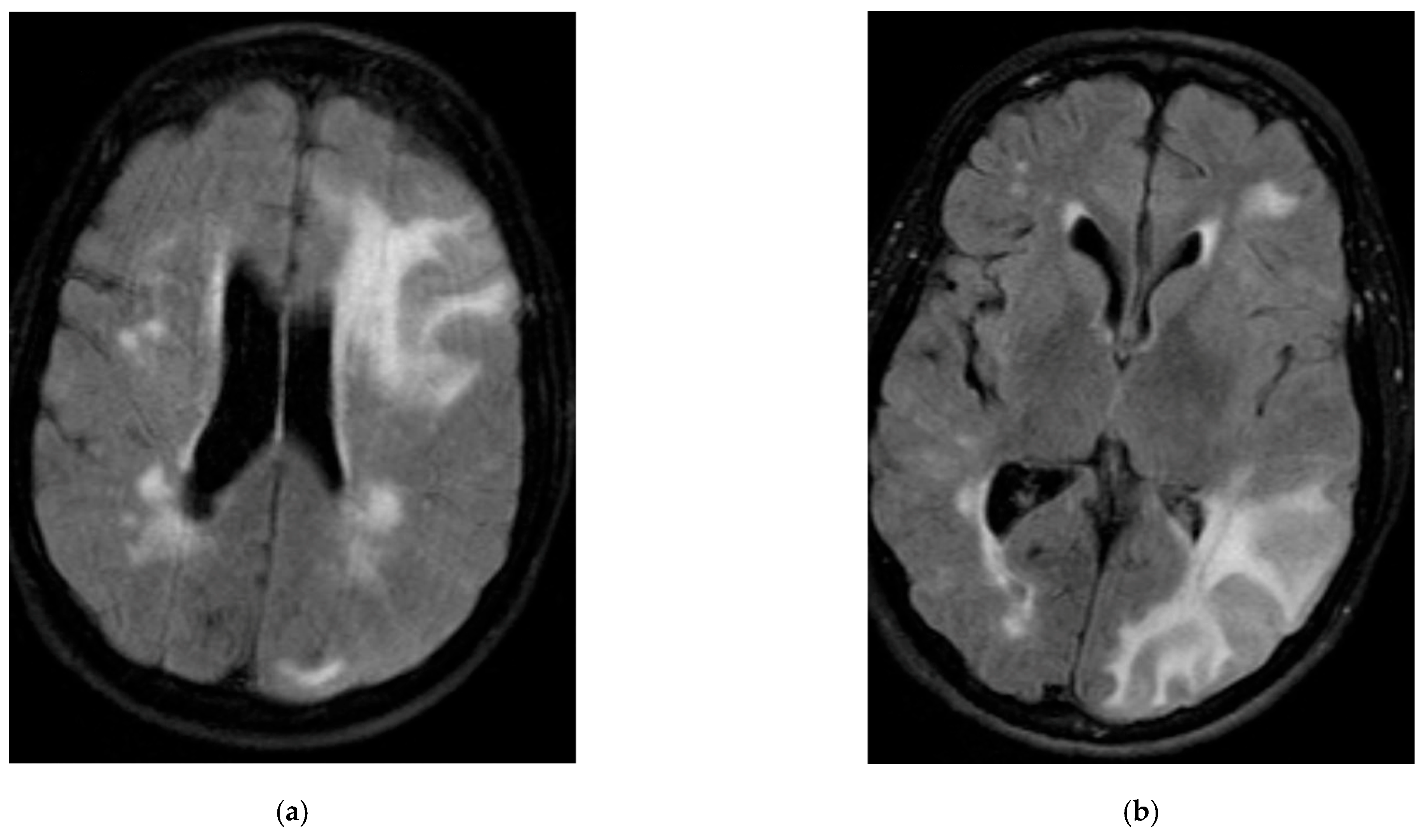 - Nada, A.; Leiva-Salinas, C.; Mahdi, E.; Mahmoud, E.; Ahsan, H.; Cousins, J.P. Multi-parametric magnetic resonance imaging evaluation of cerebral amyloid angiopathy related inflammation: Case series and review of literature. Clin. Imaging 2021, 78, 38–44. [Google Scholar] [CrossRef] [PubMed]
