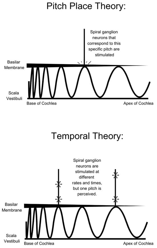 The perception of pitch is explained by two primary theories (Figure 2). The Pitch–Place Theory states that pitch perception is determined by the location of maximal vibration along the basilar membrane in response to a given frequency of sound [30]. The basilar membrane is thickest at the base and thinnest at the apex. High frequencies resonate along the base, while low frequencies resonate along the apex. This property lends to tonotopic organization of the cochlea, where frequency information is encoded by the location of activated hair cells along the basilar membrane. Tonotopic organization is mathematically described by the Greenwood function, which provides a logarithmic relationship between cochlear place and perceived pitch and is frequently used in CI programming [31,32]: