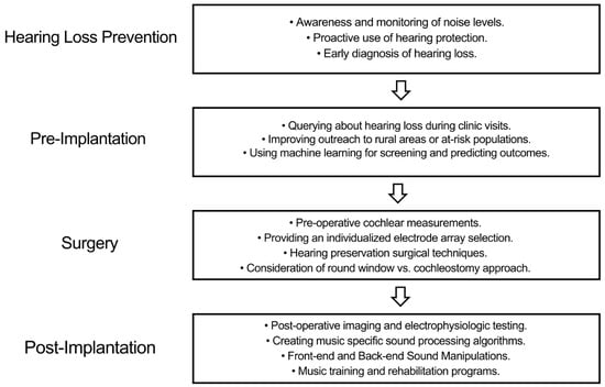 Given the current situation, we propose a multi-tiered approach towards integrating personalized medicine into cochlear implantation with the aim of achieving complete sensory restoration. Broadly, this approach can be divided into the following stages: prevention, pre-implantation, surgery, and post-implantation (Figure 3), spanning the entire continuum of care. We believe that by both incorporating these personalized medicine approaches and targeting music perception as an outcome measure of complex sound perception, we will inch closer towards complete sensory restoration.