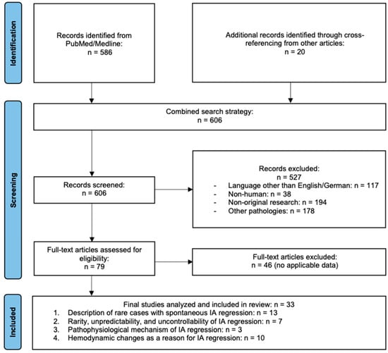 The literature overwhelmingly consists of retrospective studies and case reports, and none of the reviewed articles identified a predictive biomarker or specific early sign that could reliably indicate spontaneous IA regression. A systematic literature search was conducted according to PRISMA guidelines. A total of 606 articles were identified using database searches, and 20 additional records were included via cross-referencing. After screening and applying inclusion and exclusion criteria, 33 studies were included in the final review (see Figure 1 for PRISMA flowchart). To synthesize the data, studies were categorized into four primary themes, as also reflected in Table 1: (1) Description of rare cases with spontaneous IA regression—reports that document individual cases of IA thrombosis without intervention, including early historical descriptions. (2) Rarity, unpredictability, and uncontrollability of IA regression—literature emphasizing the unpredictability of this phenomenon and the necessity of careful follow-up. (3) Pathophysiological mechanisms of IA regression—studies proposing biological explanations, such as vasospasm or coagulation cascade alterations. (4) Hemodynamic changes as a reason for IA regression—articles linking regression to altered flow dynamics due to aging, vascular events, or surgical intervention. These categories helped to analyze the phenomenon from different perspectives, ranging from purely observational case reports to theoretical explorations of underlying mechanisms. Detailed characteristics of the included studies and their assignment to the respective categories are summarized in Table 1. Discussion and interpretation of the findings are presented in the subsequent section.