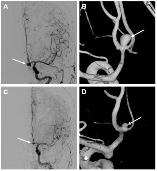 Illustrative example of spontaneous IA regression. Initial DSA (A) and the corresponding 3D reconstruction (B) show a saccular IA of the anterior communicating artery (arrow) with a size of 3 × 4 mm at the time of diagnosis. At the 9-year follow-up (C,D), the former IA visibly regressed (arrow) to a size of 2 × 2.5 mm without any interventions. Imaging did not reveal any signs of intra-aneurysmal thrombosis or wall calcification.