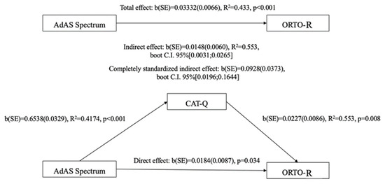 To further investigate the effect of being above the third quartile of the AdAS Spectrum and CAT-Q scores on ORTO-R scores, a two-way factorial analysis of variance (ANOVA) was conducted. Subsequently, a linear regression analysis was performed, treating the AdAS Spectrum and CAT-Q total scores as independent variables and the ORTO-R total score as the dependent variable. This analysis aimed to determine whether the total scores of the questionnaires could statistically predict higher ORTO-R scores. Given that both independent variables showed a significant association with the ORTO-R total score, a mediation analysis was carried out using the AdAS Spectrum total score as the predictor, the ORTO-R total score as the dependent variable, and the CAT-Q total score as the mediator. The Hayes PROCESS tool was utilized, and bootstrap confidence intervals for both unstandardized and standardized indirect effects were computed.