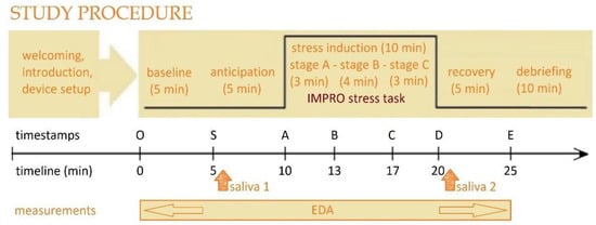 Study procedure. The experimental protocol consisted of six sequential stages: (1) welcoming and device setup, (2) baseline resting (5 min), (3) anticipation phase (5 min), (4) stress induction using the IMPRO protocol (10 min, consisting of three tasks: Stage A = 3 min, Stage B = 4 min, Stage C = 3 min), (5) recovery phase (5 min), and (6) debriefing (10 min). Salivary cortisol samples were collected at two time points: before the stress task (Saliva 1 at 5 min) and after the stress task (Saliva 2 at 20 min). Electrodermal activity was continuously recorded throughout the session, from the baseline period to the recovery phase. The timeline below indicates the experimental timestamps in minutes, with key events marked as O (start), S (baseline), A (anticipation), B (task initiation), C (mid-task), D (end of task), and E (end of recovery).