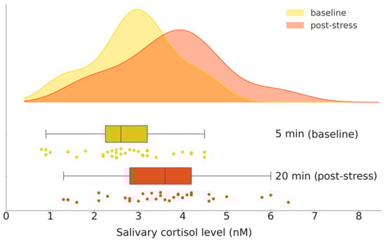 Salivary cortisol levels before (baseline) and after (post-stress) stress induction: raincloud plot.