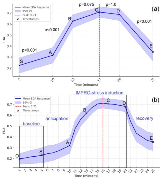 Electrodermal activity trajectory over time. Mean EDA responses are shown with 95% confidence intervals (CIs) across the experimental timeline. Signals were normalized (0–1 scale), including the baseline, and analyzed using a one-minute time window. (a) EDA changes at key timestamps (S, A, B, C, D, E) with Bonferroni-corrected pairwise comparisons. The red dashed line marks the peak response. (b) Full EDA trajectory across the baseline, anticipation, stress induction (IMPRO tasks A, B, C), and recovery. Timestamps (O–E) mark critical experimental phases.
