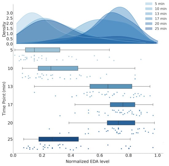 Temporal dynamics of electrodermal activity during stress and recovery: raincloud plot. The figure shows individual EDA values as jittered dots, overlaid with probability density estimates, interquartile range boxes, and median lines.