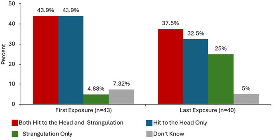 When including the first and last episode of a partner-inflicted neurologic insult, nearly half (48.9%) of all survivors experienced the co-occurrence of both head trauma and strangulation in the same incident (Table 3). On average, the first exposure to either strangulation or intentional head trauma by an intimate partner occurred at 23 years of age and the last exposure at 34 years of age (Table 3). The first exposures often involved either only head trauma (43.9%) or both head trauma and strangulation (43.9%), as shown in Figure 2; two (4.9%) of the participants only experienced strangulation and three (7.3%) did not know the type of neurologic insult that occurred on their first exposure. The last exposure to a neurologic insult experienced by survivors most commonly involved both hit(s) to the head and strangulation (37.5%) followed by direct hit(s) to the head only (32.5%) and strangulation only (25%); two (5%) of the survivors did not know what type(s) of neurologic insults occurred during their last exposure. There is a marked increase in the exposure to strangulation specifically at the time of the last neurologic insult by an intimate partner in comparison to the first time.