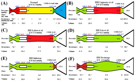 Results of modelling. (A) Normal findings. The red segment is the arterial, orange is the capillary, yellow is the veins, green is the outflow cuff and blue is the venous sinus. The vascular pressures are shown within the vessels. The blue numbers are the transmural pressures at each site. The red number is the average capillary transmural pressure. The resistances and volumes for each segment are shown below the vessel. The calculated CSF formation rate has been appended. (B) The findings in IIH from the study by Cagnazzo et al. [7]. The red area indicates an increase in resistance in the veins and the green decreased resistance compared to normal. Both the capillary TMP and CSFfr are reduced compared to normal. (C) The findings in IIH from the study by Lalou et al. [6]. Both the capillary TMP and CSFfr are increased compared to (B). (D) The findings in IIH from the study by Liu et al. [5]. Both the capillary TMP and CSFfr are increased compared to (B). (E) The findings in IIH from Lalou et al. [6]. following an infusion study. The capillary TMP and CSFfr have increased compared to the baseline study seen in (C). (F) The findings in IIH following CSF drainage, as found by Tariq et al. [10]. Both the capillary TMP and CSFfr have significantly increased. Figure 1A. Reproduced from [11] under a CC BY 4.0 commons licence.