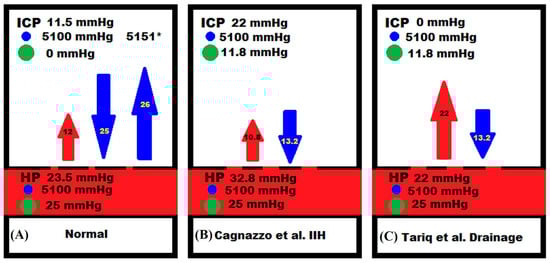 Correlation between capillary TMP and fluid flow. (A) The normal findings. The red segment is the capillary, the white the interstitial space. The small gaps in the upper wall of the capillary represent the aquaporin-4 water channels. These allow free passage of water but block salt and protein. ICP is the intracranial pressure. HP is the capillary hydrostatic pressure. The blue dot represents the salt and its osmotic pressure is beside it. The green dot represents the protein with its osmotic pressure is beside it. The red arrow represents the capillary TMP which is the ICP-HP. The middle blue arrow is the difference between the salt and protein osmotic pressure between the interstitium and the capillary. Subtracting the blue arrow from the red reveals the net pressure. This would tend to force water into the capillary at −13 mmHg. Despite this, no fluid can actually flow. Water absorption causing a 1% change in the interstitial volume would increase the interstitial osmotic pressure by 51 mmHg to 5151 as denoted with the asterisk, reversing the net osmotic pressure (right blue arrow) and reversing the fluid flow. (B) The findings in IIH from the study by Cagnazzo et al. [7]. The defects in the capillary wall are now larger, reflecting BBB breakdown. There is free flow of water and also salt, but the wall is semipermeable to protein. The capillary TMP is smaller than in the normal study. The movement of proteins has left a net osmotic gradient of 13.2 mmHg, as predicted by Equation (14). There is net fluid absorption into the capillary due to a net pressure gradient of −2.4 mmHg. (C) The findings in the study by Tariq et al. [10]. The capillary TMP has increased but the osmotic gradient is the same as (B). The net pressure gradient is +8.8 mmHg, favouring increased CSF production. *: This denotes the increased osmotic pressure, as described.