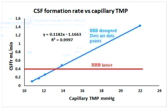 A graph of the five calculated CSF formation rates vs. the transmural pressures for the studies obtained from the literature in blue. The red line is the expected unchanged CSF formation rate if the blood–brain barrier were intact, i.e., 0.4 mL/min. Note that the three baseline studies show a CSF formation rate which is below normal, suggesting that capillary absorption must be occurring if there is a fixed 0.4 mL/min CSF formation rate from the other sites.