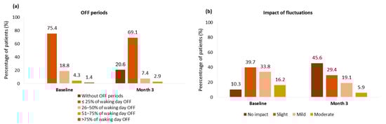 The mean OFF time was reduced from baseline to 2.2 ± 2.3 h, and 20.6% of patients no longer experienced OFF periods (Figure 2a). The mean impact of fluctuations decreased significantly from 1.6 ± 0.9 at baseline to 0.9 ± 0.9 at month 3 (p < 0.001). The percentage of patients with no impact of fluctuations increased from 10% at baseline to 45.6% after 3 months of opicapone, and the percentage of patients experiencing slight, mild, and moderate impact of fluctuations decreased (Figure 2b). Supplementary Table S1 shows statistical differences in frequency distributions of the impact of fluctuations (p < 0.001), with 41 patients (60.8%) improving at month 3.