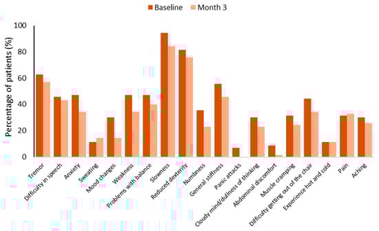 The mean baseline total WOQ-19 score of 5.1 ± 2.4 was significantly reduced by a mean of 1.3 ± 2.1 (95% CI: −1.8 to −0.8) to 3.8 ± 2.6 after 3 months of COMT inhibition with opicapone (p < 0.001). After 3 months, most of the baseline wearing-off symptoms, both motor and non-motor, decreased except for sweating and pain (Figure 3).