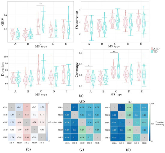 Between-group differences in the five MS parameters, including transition probability. (a) Between-group differences in the five MS parameters (TD–ASD); (b) t-values of between-group differences in transition probability; (c) the transition probability of the ASD group; and (d) the transition probability of the TD group. * p < 0.05, ** p < 0.01.