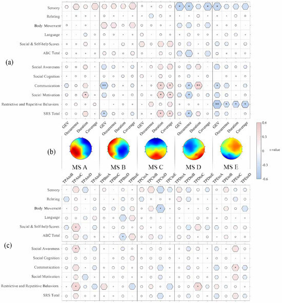 Correlations between the five MS parameters and autistic characteristics. (a) The r-values between MS parameters and ABC and SRS scores; (b) brain maps of the five microstates; (c) the r-values between MS transition probabilities and ABC scores and SRS scores. * p < 0.05, ** p < 0.01. Abbreviations: ABC: Autism Behavior Checklist; SRS: Social Responsiveness Scale.