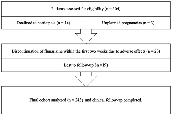 This study was designed as a retrospective observational cohort study including patients diagnosed with migraine without aura and treated with flunarizine. The study included patients diagnosed with migraine without aura who were admitted to the neurology outpatient clinic of a tertiary care center between 1 May 2022, and 1 May 2024. All subjects had been initiated on flunarizine as part of their migraine treatment regimen. Flunarizine was the first-line treatment in all cases. To minimize clinical heterogeneity and ensure a more uniform study population, all subjects were diagnosed with episodic migraine without aura according to the International Classification of Headache Disorders, 3rd edition (ICHD-3) [18] criteria, as confirmed by a board-certified neurologist specialized in headache disorders.