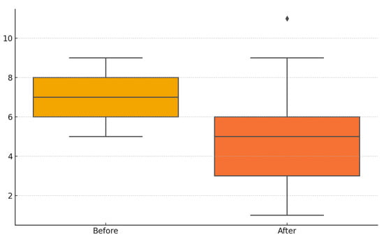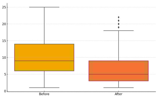 All statistical analyses were performed using Python (version 3.11, Python Software Foundation, 2025) in a Jupyter Notebook environment. The pandas, scipy, statsmodels, matplotlib, and seaborn libraries were utilized for data processing, hypothesis testing, modeling, and visualization. Descriptive statistics were computed to summarize demographic and clinical features, with continuous variables expressed as medians and interquartile ranges and categorical variables as frequencies and percentages. The Wilcoxon signed-rank test was used to compare the pre- and post-treatment number of headache days and the NPRS and MIDAS scores. Between-group comparisons were performed using the Mann–Whitney U test for non-normally distributed continuous variables. Associations between age, gender, baseline pain intensity, and MIDAS improvement were further explored using an ordinary least squares (OLS) linear regression model. A two-tailed p value of less than 0.05 was considered statistically significant.