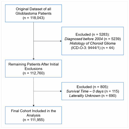Patients were diagnosed with primary GBM prior to study enrollment. They were identified using the International Classification of Diseases for Oncology—Third Edition (ICD-O-3) morphology codes [20], which are further delineated in Supplementary Table S1. For consistency and to assess temporal trends, the data were stratified into four periods: 2005–2008, 2009–2012, 2013–2016, and 2017–2020. Patients with a survival time of 0 days or unknown laterality were excluded to ensure the completeness and reliability of the final analytic cohort (Figure 1).