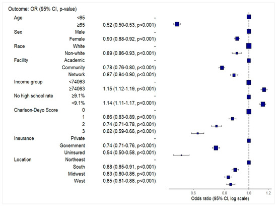 In multivariable logistic regression, several demographic, clinical, and socioeconomic factors were associated with a higher likelihood of receiving combined surgery, radiation, and chemotherapy (Sx+RT+Chemo) (Figure 2). Patients aged ≥65 years (OR: 0.52, 95% CI: 0.50–0.53), female patients (OR: 0.90, 95% CI: 0.88–0.92), and non-White patients (OR: 0.90, 95% CI: 0.86–0.94) had lower odds of receiving combined Sx+RT+Chemo. Treatment at community (OR: 0.78, 95% CI: 0.76–0.80) or network facilities (OR: 0.87, 95% CI: 0.84–0.90) was also associated with lower odds compared to academic centers. Patients residing in areas with higher median income (≥$74,063) (OR: 1.15, 95% CI: 1.12–1.19) and lower proportions of adults without high school education (<9.1%) (OR: 1.14, 95% CI: 1.11–1.17) were more likely to receive combined Sx+RT+Chemo.