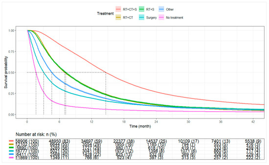 Kaplan–Meier curve for overall survival by treatment categories. Abbreviations: RT+CT+S: Radiation, chemotherapy, and surgery; RT+CT: Radiation and chemotherapy; RT+S: Radiation and surgery; Surgery: Surgery alone; No Treatment: No radiation, chemotherapy, or surgery.