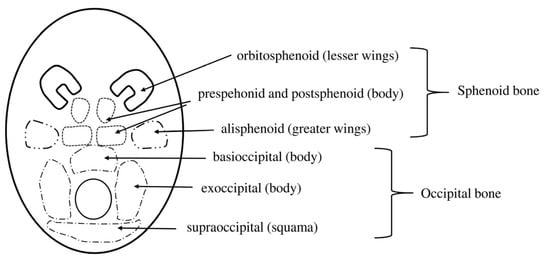 - Zhang, Q.; Wang, H.; Udagawa, J.; Otani, H. Morphological and morphometric study on sphenoid and basioccipital ossification in normal human fetuses. Congenit. Anom. 2011, 51, 138–148. [Google Scholar] [CrossRef]