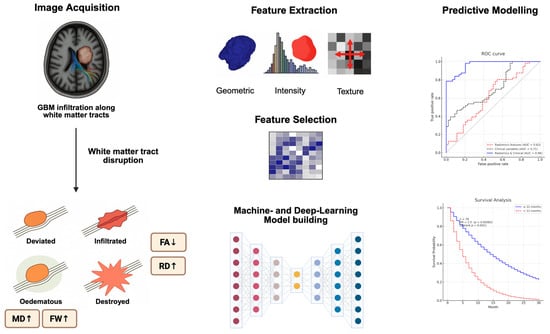 Schematic overview illustrating the integration of structural and diffusion imaging biomarkers in GBM. Tumour infiltration disrupts white matter tracts, which is reflected in altered DTI metrics (e.g., reduced FA, elevated MD, radial diffusivity (RD), and free-water fraction). Quantitative radiomic features (shape, intensity, and texture) are extracted from tumour and peritumoral regions. Following feature selection, machine learning and deep learning models are trained to predict clinical outcomes.