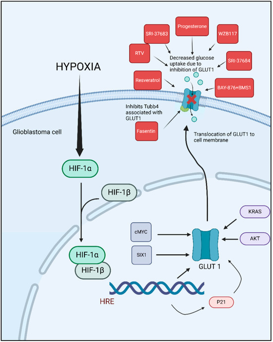 The expression of GLUT1 is an important hallmark of many cancers, such as breast cancer, ovarian cancer, prostate cancer, and GBM [19,20,21,22]. Different transcription factors, such as HIF-1α [23], c-Myc [24,25], K-Ras pathway [26], and PI3K/Akt [27,28] pathways, have been implicated in the upregulation of GLUT1 in hypoxic conditions [29]. Growth factors also play an important role in GLUT1 translocation via the PI3K/AKT pathway, which regulates cell proliferation and growth in many cancers [30].