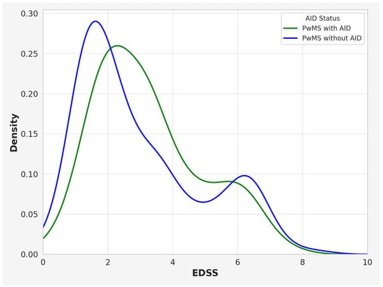 Furthermore, the cohort of PwMSs with co-occurring AIDs exhibited a higher mean EDSS score in comparison to PwMSs without additional AIDs (3.00 IQR: 1.75–4.25 vs. 2.50, IQR 1.25–3.75; p = 0.0261). Kernel density plots were used to visualize the distribution of EDSS in PwMSs with and without AIDs (Figure 2).