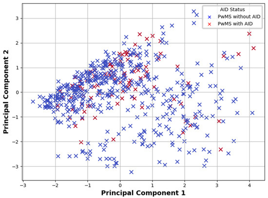 PCA was applied to examine whether underlying clinical patterns could differentiate PwMSs with and without AIDs. The analysis aimed to explore underlying patterns in the dataset and identify clustering based on AIDs status. The first two principal components captured the majority of the variance. Visual inspection of the PCA plot (Figure 3) revealed partial but not complete separation between PwMSs with and without AIDs, suggesting that while multivariate structure exists, substantial clinical overlap remains across groups.