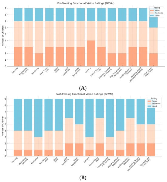 Qualitative data from the GFVAI are presented in Figure 1, which reflects group-level distributions. Prior to the intervention, most children demonstrated low to moderate ratings in functional vision skills; no child had a “none” rating in any of the categories. Following the training program, the trend shifted clearly toward moderate to good performance across both near and distant visual tasks.