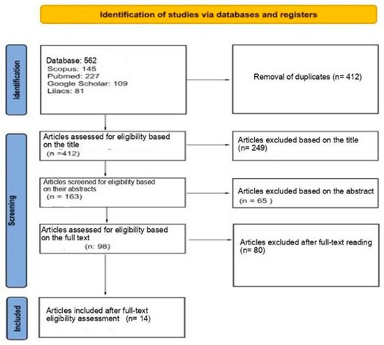 The searches yielded 562 references, distributed as follows: 145 from Scopus, 227 from PubMed, 109 from Google Scholar, and 81 from Lilacs. A total of 150 duplicate articles were excluded by the authors. Afterward, title and abstract screening was conducted, resulting in 98 references. Finally, following full-text review, 14 articles were included in the final analysis, as illustrated in the diagram below, which outlines the study selection process for this scoping review (Figure 1).