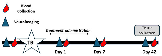 Blood samples were collected from all piglets via jugular vein access into EDTA tubes to isolate plasma. Blood was collected at baseline (pre-TBI), immediately prior to treatment administration on day 1 post-TBI, and again at 7 and 42 days post-TBI (Figure 1). Plasma samples were flash frozen in liquid nitrogen and stored in −80 °C until analysis.