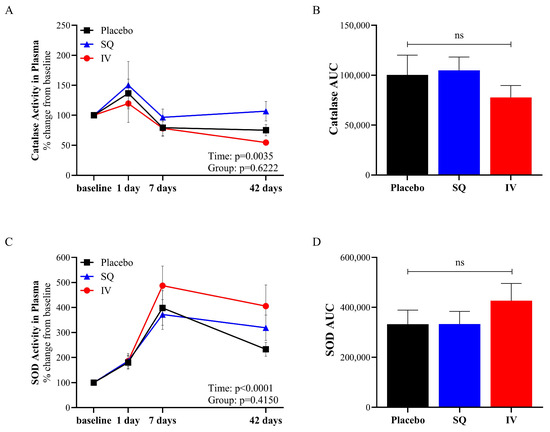 Antioxidant enzymatic activity in plasma from placebo (n = 10), SQ (n = 9), and IV (n = 9) piglets following TBI induction. Catalase activity in plasma (A), AUC calculated from catalase activity in plasma from baseline to 42 days post-TBI (B), SOD activity in plasma (C), and AUC calculated from SOD activity in plasma from baseline to 42 days post-TBI (D). AUC: area under the curve; SOD: superoxide dismutase; SQ: subcutaneous treatment group; IV: intravenous treatment group.