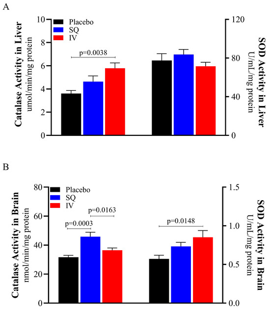Catalase and SOD activities were assessed in both the liver and brain to evaluate tissue-specific antioxidant responses following TBI (Figure 3). CMX-2043 increased hepatic catalase activity, as well as catalase and SOD activity in the brain. Interestingly, the administration route of CMX-2043 influenced catalase and SOD activity differently in brain and liver tissues. Specifically, IV piglets exhibited 46.3% higher catalase activity in the liver than placebo (5.7900 ± 0.4518 μmol/min/mg protein and 3.6126 ± 0.2608 μmol/min/mg protein for IV and placebo, respectively; p = 0.0038), while the SQ group was not statistically different (4.6410 ± 0.4894 μmol/min/mg protein; p > 0.05) (Figure 3A). SOD activity in the liver did not differ significantly between SQ, IV, and placebo treatment groups (83.6760 ± 5.2844, 71.5300 ± 4.1467, 77.4373 ± 7.0645 U/mL/mg protein, respectively; p > 0.05).
