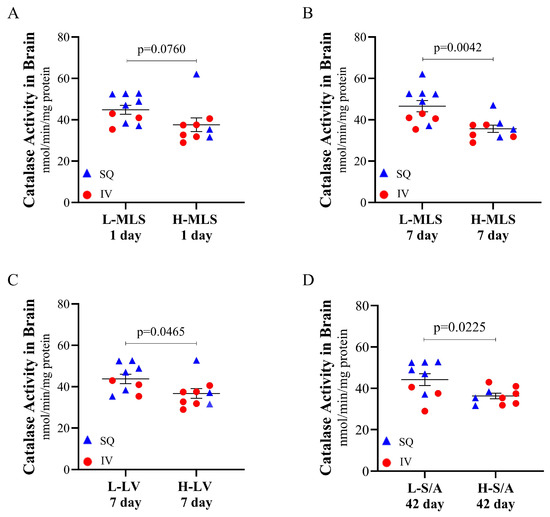Catalase activity at 42 days post-TBI in the brain of CMX-2043-treated piglets stratified by MRI-defined injury severity groups. Catalase activity is stratified by low and high 1 day midline shift (A), low and high 7 day midline shift (B), low and high 7 day lesion volume (C), and low and high 42 day swelling/atrophy (D) in piglets receiving CMX-2043 treatment (n = 19). L-: low group; H-: high group; MLS: midline shift; LV: lesion volume; S/A: swelling/atrophy; SQ: subcutaneous treatment group; IV: intravenous treatment group.