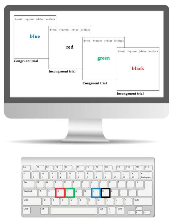 The Stroop task is a widely used measure of inhibitory control in children with ADHD [73,74]. In this study, a keyboard-based version of the Stroop task was utilized (see Figure 1), with specific keys assigned to represent different colors on a 24-inch computer monitor. The designated keys were “D” for red, “F” for green, “J” for blue, and “K” for black, each marked with a corresponding colored sticker for visual reference. During the task, participants were shown color words that either matched the text color (congruent trials) or differed from it (incongruent trials). For instance, in a congruent trial, the word “red” would appear in red ink, requiring the participant to select “D.” In an incongruent trial, the word “red” might appear in blue ink, necessitating a response corresponding to blue (key “J”). Participants were instructed to press on the corresponding key to make a response, and to respond as quickly and accurately as possible. Response times and accuracy (correct vs. incorrect responses) were recorded. The task was developed using Inquisit and consisted of four Stroop task blocks, each lasting 50 s, with 20 s rest intervals between blocks.