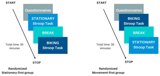 This figure shows the flow of the experimental procedure. The left represents the experimental procedure if a participant was randomized to perform the stationary condition first; the right represents the experimental procedure if a participant was randomized to perform the biking movement condition first.