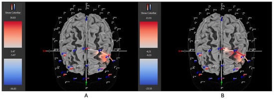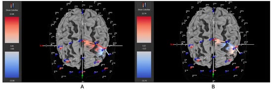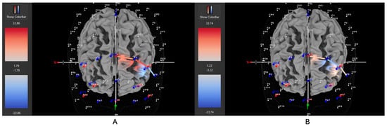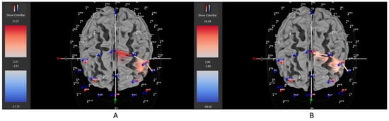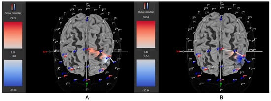 These are representative images of a male participant when comparing concentrations of oxygenated hemoglobin in the left DLPFC between the (A) movement and (B) stationary condition. The red shade on the right (left hemisphere) indicates greater oxygenated hemoglobin in the regions of interest (i.e., F1, F3, and F5) corresponding to the left DLPFC during the (A) movement condition. The images are masked to only show channels over the ROI. The color scale depicts maximum and minimum activation values for oxygenated hemoglobin (red) and deoxygenated hemoglobin (blue).
