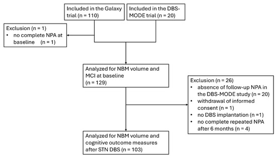 Flowchart of the inclusion of patients in the analysis. DBS, deep brain stimulation; MCI, mild cognitive impairment; NBM, nucleus basalis of Meynert; NPA, neuropsychological assessment; STN, subthalamic nucleus.