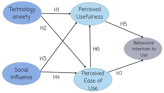 Additionally, TAM allows for the inclusion of external variables that can influence technology adoption, such as social influence and technological anxiety. Social influence encompasses the impact of close relationships, family, friends, or caregivers on an individual’s decision to use technology. In contrast, technological anxiety refers to the fear or discomfort associated with using digital devices, which can act as a significant barrier to adoption. Prior research has confirmed that these factors play a crucial role in shaping technology adoption among older adults, demonstrating that perceived usefulness and ease of use remain central to their willingness to engage with digital tools [9,10,11].