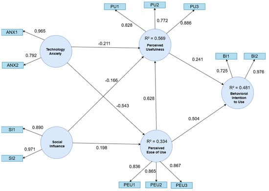To evaluate the quality of model fit in the structural model, the explained variance (R2) was used, an essential metric in structural analysis that indicates the percentage of variance in a dependent variable that can be explained by the independent variables included in the model. In other words, R2 reflects how well the model captures the theoretical relationships among the studied constructs. According to Hair et al. [48], an R2 value above 0.10 is acceptable for exploratory research, while values exceeding 0.50 are characteristic of models with high explanatory power in confirmatory studies.