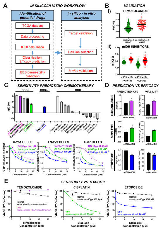 Efficacy prediction model for chemotherapeutic drugs with potential effect in GBM: (A) Schematic of the predictive pipeline used to identify alternative therapeutic candidates for glioblastoma. The process includes data processing of TCGA glioma datasets, IC50 estimation, efficacy prediction, and subsequent drug classification. Additional in silico assessments include blood-brain barrier (BBB) permeability predictions and target expression analysis, followed by selection of appropriate GBM cell lines for in vitro validation. (B) Validation of the algorithm using drugs with known or proposed activity in glioma. I) Predicted IC50 values for Temozolomide (TMZ) stratified by MGMT promoter methylation status (met: methylated; un-met: unmethylated). II) Predicted IC50 values for AGI-5198 and AGI-6780, selective inhibitors of mutant IDH1/2 (mIDH), in patients with either mIDH or wild-type IDH (wtIDH). All IC50 values are represented as ln(IC50). (C) Predicted IC50 values for conventional chemotherapeutics in wtIDH glioma patients compared to TMZ, categorized by BBB permeability prediction (BBB+: permeable; BBB+/−: ambiguous; BBB–: non-permeable). Commercial GBM cell lines (U251, LN229, U87) were treated with increasing concentrations of TMZ, Cisplatin, or Etoposide for 72 h. Cell viability was assessed by MTT assay in at least three independent biological replicates and six technical replicates per condition. Concentration–response curves were generated, and IC50 values were calculated using non-linear regression. * p < 0.05 vs. TMZ; ^ p < 0.05 vs. all other drugs (ANOVA). (D) Comparison of in silico predicted IC50 values and in vitro cytotoxicity for TMZ, Cisplatin, and Etoposide in mIDH and wtIDH glioma neurospheres. For in vitro validation, neurospheres were treated with fixed concentrations of each drug (TMZ: 15 µM; Cisplatin: 5 µM; Etoposide: 2.5 µM). Cell viability was measured by the MTT assay. (E) Cytotoxic effects of TMZ, Cisplatin, and Etoposide in normal murine astrocytes and GBM neurospheres. Cells were treated for 72 h with various drug concentrations, and IC50 values were determined as in C. * p < 0.05 vs. TMZ; ^ p < 0.05 vs. all other drugs (ANOVA); + p < 0.05 vs. normal astrocytes (Student’s t-test).