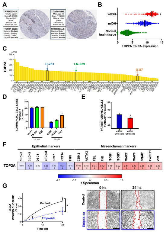 In Vitro Validation of Model-Predicted Etoposide Sensitivity in GBM Cells: (A) Representative immunohistochemistry (IHC) images of TOP2A expression in glioblastoma (GBM) patient biopsies obtained from the Human Protein Atlas (HPA). Scale bar, 200 µm. (B) Analysis of TOP2A mRNA expression in normal brain tissue versus glioma biopsies (mIDH and wtIDH), using datasets from TCGA LGG-GBM and GTEx. (C) TOP2A transcript levels in human GBM cell lines, based on HPA data. Expression values are shown as average transcripts per million (TPM) from replicate samples for each cell line. (D) Cytotoxic effects of Etoposide on U-251, LN229, and U-87 GBM cells with differential TOP2A expression. Cells were treated with increasing concentrations of Etoposide for 72 h, and viability was assessed via MTT assay. * p < 0.05 vs. U251 (ANOVA). (E) Patient-derived glioma cells with mIDH (G01) and wtIDH (G08) genotypes were treated with 2.5 µM Etoposide for 72 h, and cell viability was determined using the MTT assay. * p < 0.05 (Student’s t-test). (F) Spearman correlation between TOP2A expression and the expression of genes associated with the epithelial–mesenchymal transition (EMT). r: Spearman correlation coefficient. * p < 0.05. (G) U-251 GBM cells were grown to confluence and treated with 1 µM Etoposide for 24 h. Cell migration was assessed using a wound-healing assay. Wound area was quantified with ImageJ software, and closure was calculated relative to the area at time 0. Wound borders are outlined using red lines to aid visualization. Scale bar, 100 µm. * p < 0.05 vs. control (nonlinear regression analysis).