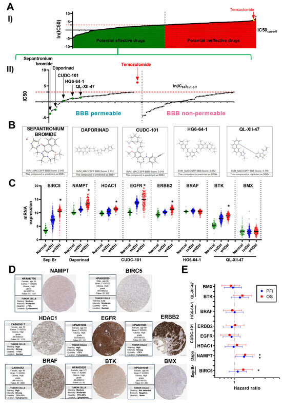 Prediction model for alternative drugs with potential therapeutic effect in GBM: (A) Identification of top candidate drugs for wtIDH glioma patients, based on efficacy predictions. (I) Drugs were classified as potentially effective or ineffective using the median of median predicted ln(IC50) values for 272 compounds as a cutoff. (II) Potentially effective drugs were further categorized based on predicted blood-brain barrier (BBB) permeability: BBB+ (permeable) and BBB− (non-permeable). A shortlist of five candidate drugs was generated according to efficacy and BBB+ status: Sepantronium bromide (BIRC5 inhibitor), Daporinad (NAMPT inhibitor), CUDC-101 (HDAC, EGFR, and ERBB2 inhibitor), HG6-64-1 (BRAF inhibitor), QL-XII-47 (BMX and BTK inhibitor). (B) Summary of BBB permeability predictions for the drugs evaluated in this study. (C) Analysis of mRNA expression levels of the molecular targets of selected drugs in normal brain tissue and glioma samples (mIDH and wtIDH), using transcriptomic data from TCGA. (D) Representative IHC images showing protein expression of the targets of shortlisted drugs in GBM patient biopsies, obtained from The Human Protein Atlas. Scale bar, 200 µm. (E) Forest plot analysis of progression-free interval (PFI) and overall survival (OS) in wtIDH glioma patients, stratified by high vs. low expression levels of each drug target. * p < 0.05, Log-rank (Mantel–Cox) test. All IC50 values are shown as natural log-transformed (ln IC50) values.