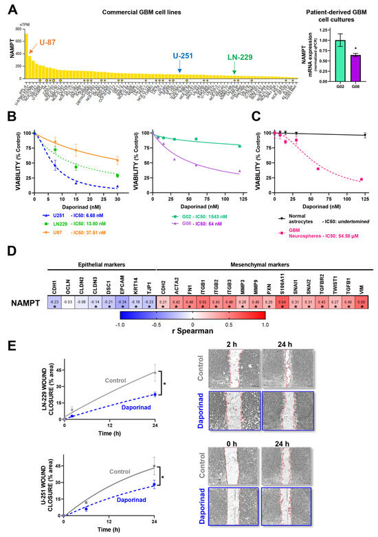 In Vitro Validation of Model-Predicted Daporinad Sensitivity in GBM Cells: (A) NAMPT mRNA expression levels in human GBM cell lines, using data from The Human Protein Atlas and relative NAMPT expression levels (RNA-seq) in patient-derived GBM cells G02 (NAMPThigh) and G08 (NAMPTlow). *, p < 0.05, Mann–Whitney test. (B) Evaluation of Daporinad cytotoxicity in commercial GBM cell lines (U-251, LN-229, U-87), patient-derived GBM biopsy-derived cultures, and (C) murine normal astrocytes and GBM neurospheres, following treatment with increasing concentrations of Daporinad for 72 h. Cell viability was assessed by MTT assay, and IC50 values were calculated using nonlinear regression from concentration–response curves. (D) Spearman correlation analysis between NAMPT expression and proteins involved in epithelial–mesenchymal transition (EMT). r, Spearman coefficient. * p < 0.05. (E) Evaluation of cell migration in LN-229 and U-251 cells. After reaching confluence, cells were treated with Daporinad (10 nM) for 24 h, and wound closure assays were performed at multiple time points. Wound area was quantified with ImageJ software, and closure was calculated relative to the area at time 0. Wound borders are outlined using red lines to aid visualization. * p < 0.05 vs. control (nonlinear regression analysis).