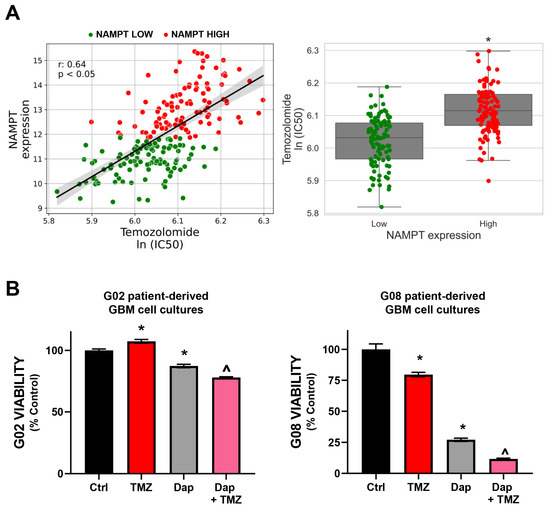 Potential of Daporinad in combination with Temozolomide (TMZ) in GBM cells: (A) Spearman correlation between NAMPT expression and TMZ predicted efficacy (left panel) in GBM patients. Green and red dots represent NAMPT low and high expression levels, respectively. Predicted ln(IC50) values for TMZ in wtIDH glioma patients, stratified by NAMPT expression (right panel). Patients were classified into “Low” and “High” NAMPT expression groups using the median expression value as a threshold. p < 0.05; Mann–Whitney test. (B) Cell viability of G02 and G08 cells treated with Daporinad (60 nM), Temozolomide (150 µM), or their combination for 72 h, assessed by MTT assay. *, p < 0.05 vs. control; ^, p < 0.05 vs. drugs alone. ANOVA with Tukey’s multiple comparisons test.