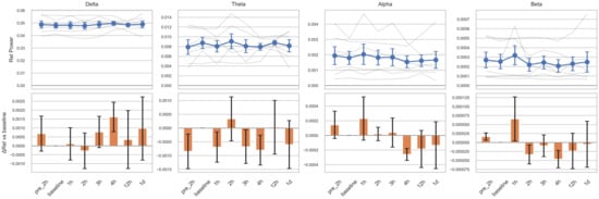 Relative EEG power changes across frequency bands before and after tocilizumab treatment. For each frequency band, the top row illustrates individual subject trajectories (semi-transparent gray lines) and the group mean ± standard error of the mean (SEM), shown as blue circles with error bars. Time points on the x-axis are pre-2 h (2 h before tocilizumab), baseline (1 h before tocilizumab), 1 h, 2 h, 3 h, 4 h, 12 h, and 1 d (1 day after tocilizumab). The bottom row displays bar plots of the change in relative power (ΔRel), calculated as the mean difference from each subject’s baseline value and shown with orange bars ± SEM. The baseline thus serves as the statistical reference point for all comparisons. Statistical comparisons were performed using linear mixed-effects models with subject-level random intercepts. No statistically significant changes from the baseline were observed in any time point or frequency band.