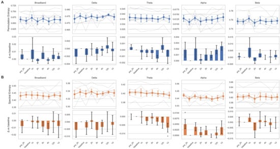 Temporal changes of entropy measures across frequency bands before and after tocilizumab treatment. Permutation entropy (A) and spectral entropy (B) are shown for five canonical frequency bands: broadband, delta, theta, alpha, and beta. For each entropy measure, the top row displays temporal trajectories across eight time points—pre-2 h (2 h before tocilizumab), baseline (1 h before), 1 h, 2 h, 3 h, 4 h, 12 h, and 1 d (1 day after)—with individual subject traces in semi-transparent gray lines and the group mean ± standard error of the mean (SEM) overlaid in colored markers (blue for A, orange for B). The bottom row shows the change in entropy relative to the baseline (Δ vs. baseline), represented as bar plots of the mean difference with SEM. Bars are color coded by entropy type (blue for permutation entropy, orange for spectral entropy), and statistical significance was assessed using linear mixed-effects models with subject-level random intercepts. Asterisks indicate comparisons that reached nominal significance (* p < 0.05).