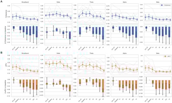 To assess functional connectivity, we employed two complementary measures, coherence and the weighted phase lag index (wPLI), which capture both amplitude- and phase-based coupling [,]. A multitaper spectral estimator was applied to compute cross-spectral density matrices from non-overlapping 5 s epochs. Connectivity was calculated within five canonical frequency bands: delta (1–4 Hz), theta (4–8 Hz), alpha (8–13 Hz), beta (13–30 Hz), and broadband (1–30 Hz). Connectivity metrics were computed using the “spectral_connectivity_epochs” function from the MNE-Connectivity package (v0.7.0). For each frequency band and method, connectivity values were averaged across all channel pairs to yield a global connectivity measure for each subject at each time point.