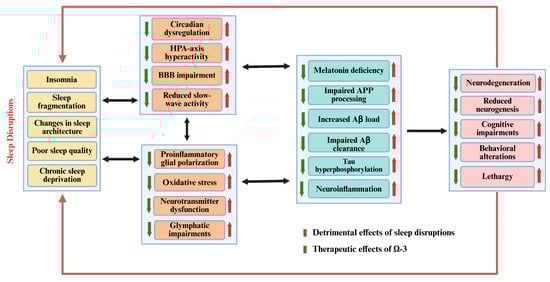 Although there are many treatments available to address sleep disruptions and AD, they come with their own set of limitations, including addiction, recurrence, inefficiency, and individual variations in therapeutic response. To address these limitations, omega (n)-3 fatty acids (FAs) can be used as a safe and effective therapeutic alternative, as studies have reported that n-3 can ameliorate the aforementioned neuropathological changes associated with SD and early-stage AD. This review will help to elucidate the sleep-related changes in normal aging and AD and the pathological similarities between SD and AD, especially with reference to neuroinflammatory changes, amyloid processing, and the therapeutic application of n-3 FAs due to their wide range of biological activities for treating SD and AD. Finally, recommendations for future studies will be shared. A brief schematic diagram of the reported interactions is shown below (Figure 1):